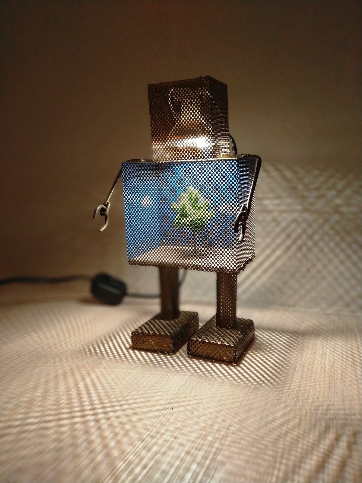 魯宓 Lumi - 立體藝術複合媒材創作者,擅長運用網孔來呈現有趣的視覺現象,並以其笨拙可愛的方塊機器人,