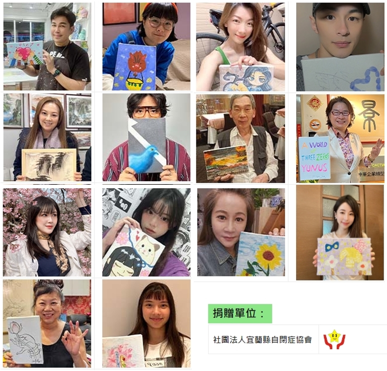 名人公益畫作: 網紅 山豬妹/陳沛冪 |藝人 林智賢|歌手 喬幼 芒果公主|藝人 劉韋辰|網紅 洪貝兒JazzBell|藝人 原子少年 羅奕傑|罕見疾病基金會常務監事 蔡元鎮|財團法人台灣尤努斯基金會董事長 蔡慧玲律師|藝術家Annika胡馨芸|網紅 陳映彤/霆妹|財團法人台灣尤努斯基金會 執行長王絹閔|全中運跆拳道金牌國手 蔡苡菲|星瀚國際傳播有限公司 負責人莊雅庭|部落客 飛行馬迷