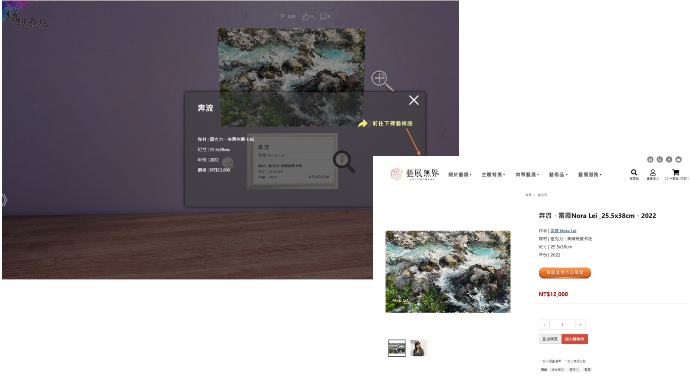 您可以直接在虛擬展間中連結藝展無界平台購買您喜愛的藝術作品,為藝術家提供更廣泛的展示平台,也讓觀眾能夠在展覽中即時將喜愛的藝術品帶回家
