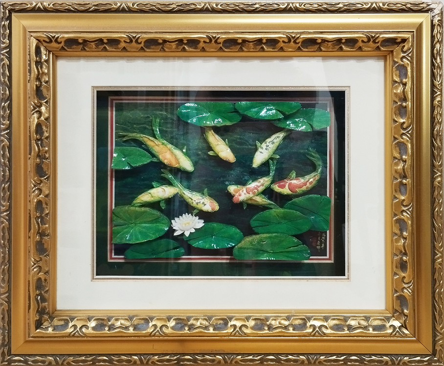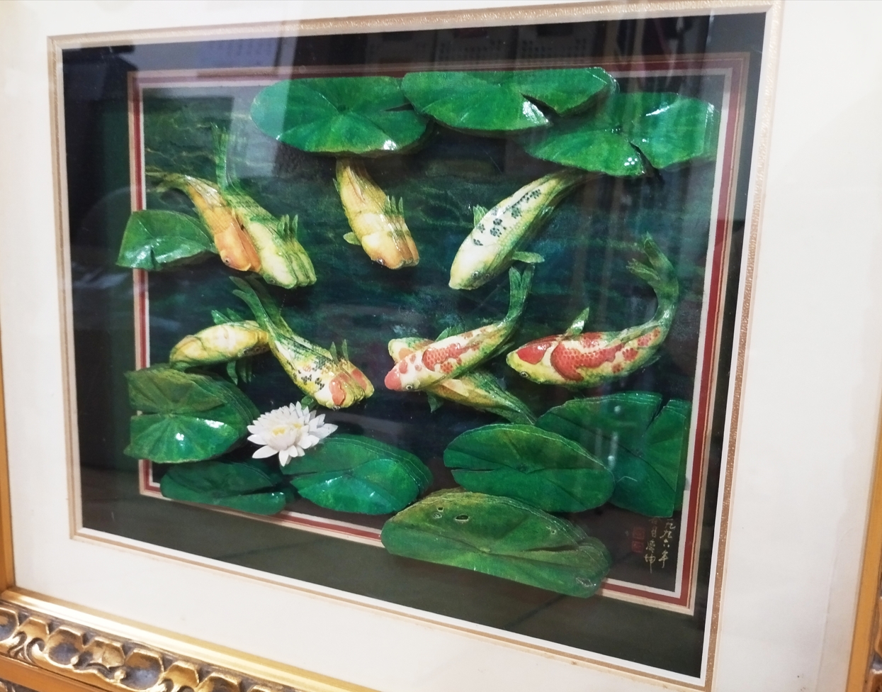 此圖名為「九如集錦」,九隻錦鯉代表著長久富貴,錦繡前程之意,圖中魚兒全都悠游齊聚,也預意著所有好運都將悠然而至